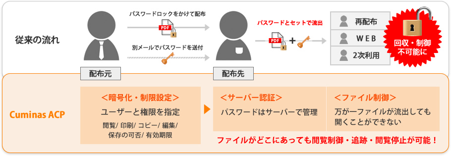 Cuminas ACP (Active Content Protection)は、重要なPDFデータの情報漏洩対策、ファイル配布先での2次利用防止を目的としたファイル暗号化・コンテンツセキュリティシステムです。